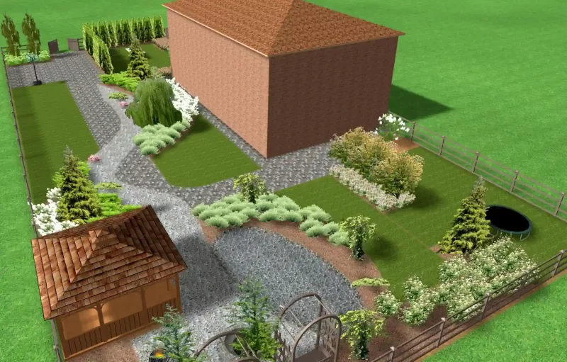 Узкий участок между домом и забором «разрезали» на полосы дорогой. Причем, правая сторона должна остаться открытой, для игры в футбол на газоне.