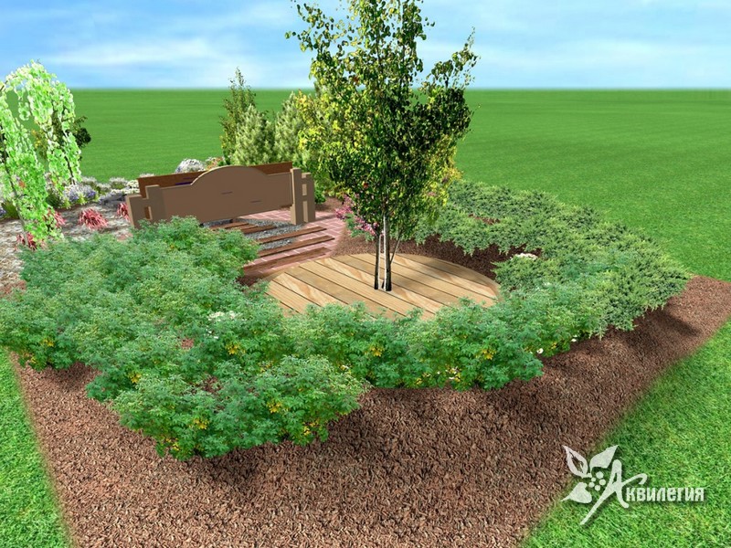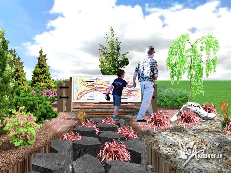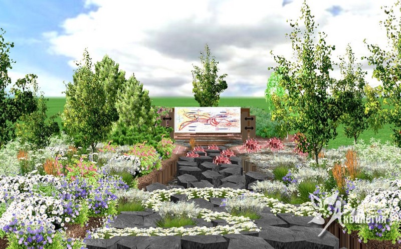 Холм, окружающий деревянный настил, означает защиту и ассоциируется с окопами, где немало времени провели бойцы. Растения, используемые в проекте – символичны: это роза морщинистая, которая ассоциируется с колючей проволокой концлагерей, красные ягоды –как капли пролитой крови, цветы – как символ несломленности и чистоты человеческой души; барбарис «Атропурпуреа» – наступление Красной Армии и вытеснение противника с завоеванных им территорий; дицентра – образ партизан, которые незаметны среди лесов (ель, сосна), но оказали огромную помощь в победе над врагом.