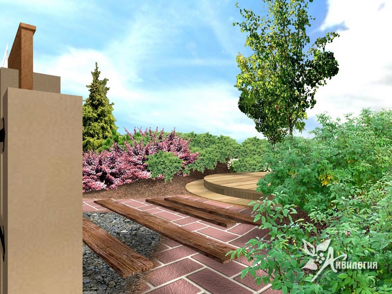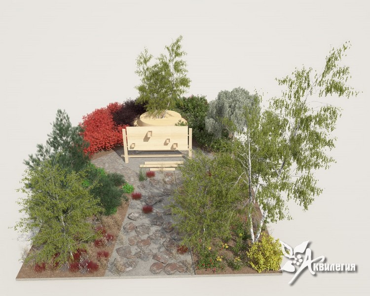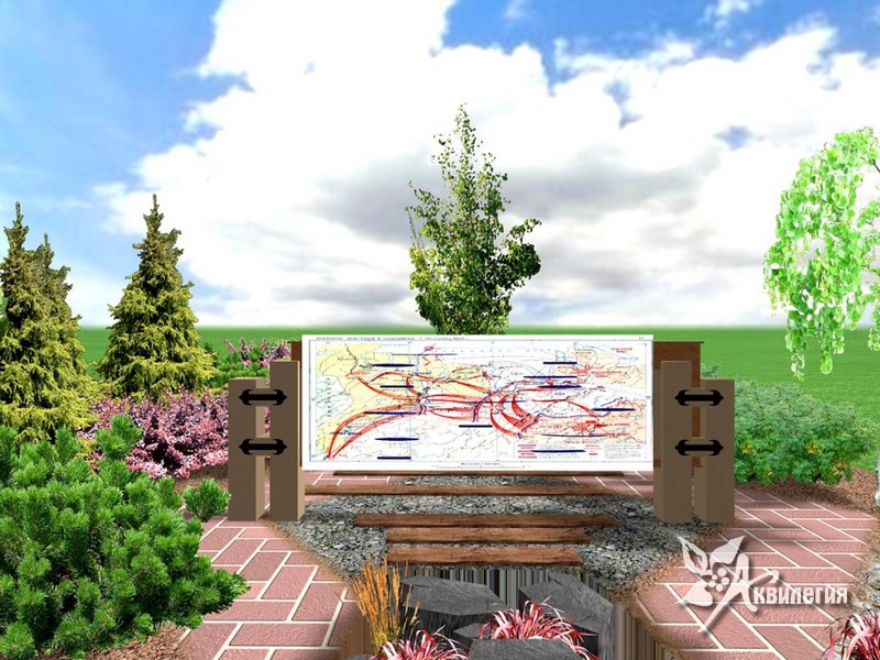 Расходящиеся дорожки из клинкерного кирпича терракотового цвета подчеркивают наступление Советской Армии с разных фронтов, которые сходятся в одной точке – это Победа и Родина. Родина – это березки, которые высажены в виде «букетной посадки», как букеты цветов, которыми встречали победителей.